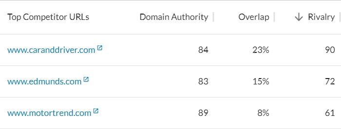 These are Ford’s #1, #2, and #5 competitors, and they aren’t automakers — they’re automotive content producers. Does this mean that Chevy and Tesla aren’t Ford’s competitors? Of course not. It means that those automakers are infrequently appearing in SERPs alongside Ford. Ford is competing with mentions of their own products (makes and models) in leading online publications.